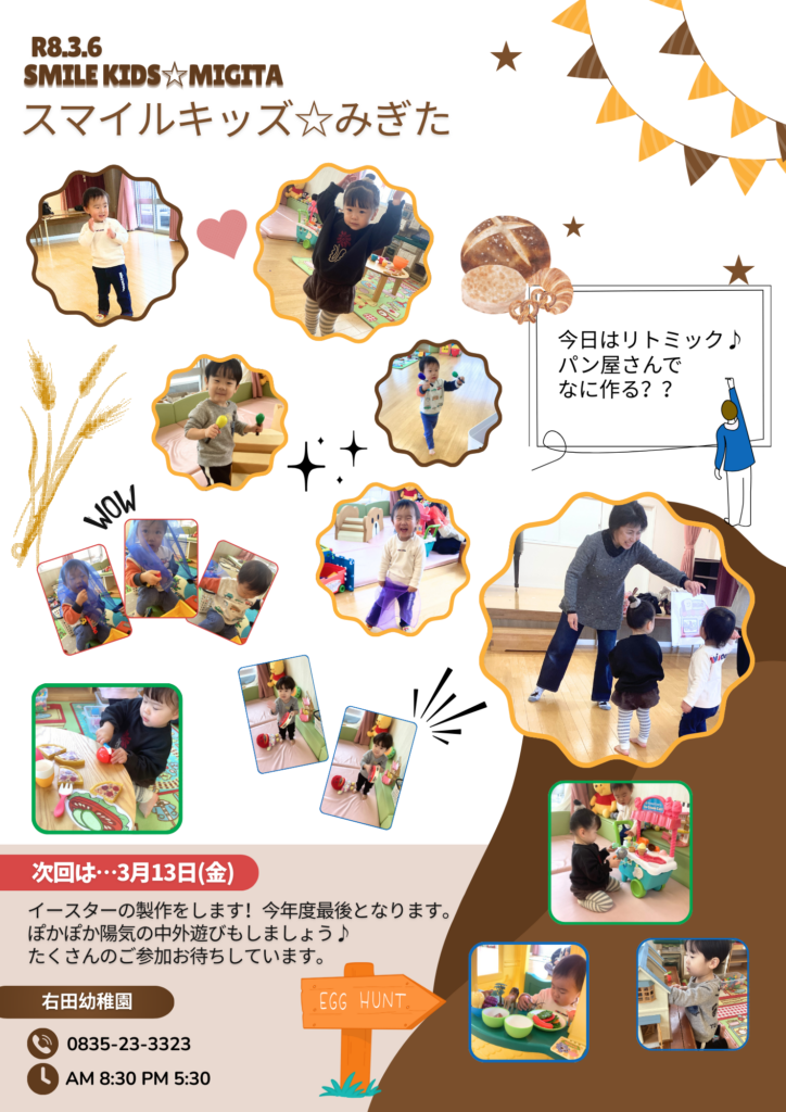 3月6日(金)に行われたスマイルキッズ☆みぎたの様子です。 明日(3月13日(金))のスマイル☆キッズみぎたは、イースターの製作を行います。 開催時間は10時~12時となっております。暖かくなってきましたので各自で水筒をご持参ください。 参加をご希望の方は右田幼稚園(0835-23-3323)までご連絡ください。 皆さまのお越しを心よりお待ちしております。